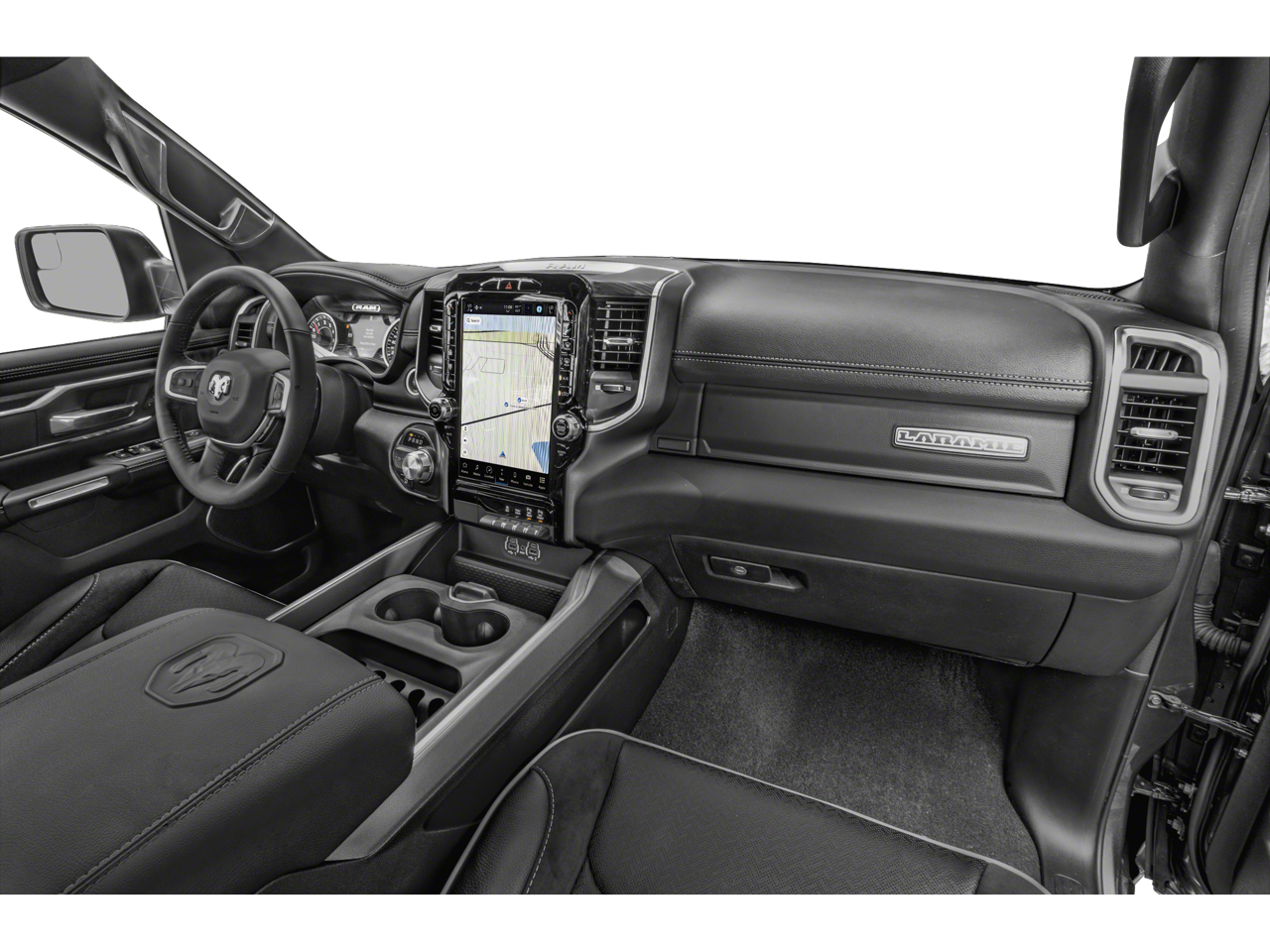 The Laramie's interior is a true sanctuary of comfort and convenience, with premium leather-trimmed bucket seats, a spacious center console, and a massive 12-inch touchscreen display that puts all your connectivity and navigation needs at your fingertips. Enjoy the added peace of mind with advanced safety features like Blind Spot and Cross-Path Detection, ParkSense Front/Rear Park Assist, and a Rear Power Sliding Window.
