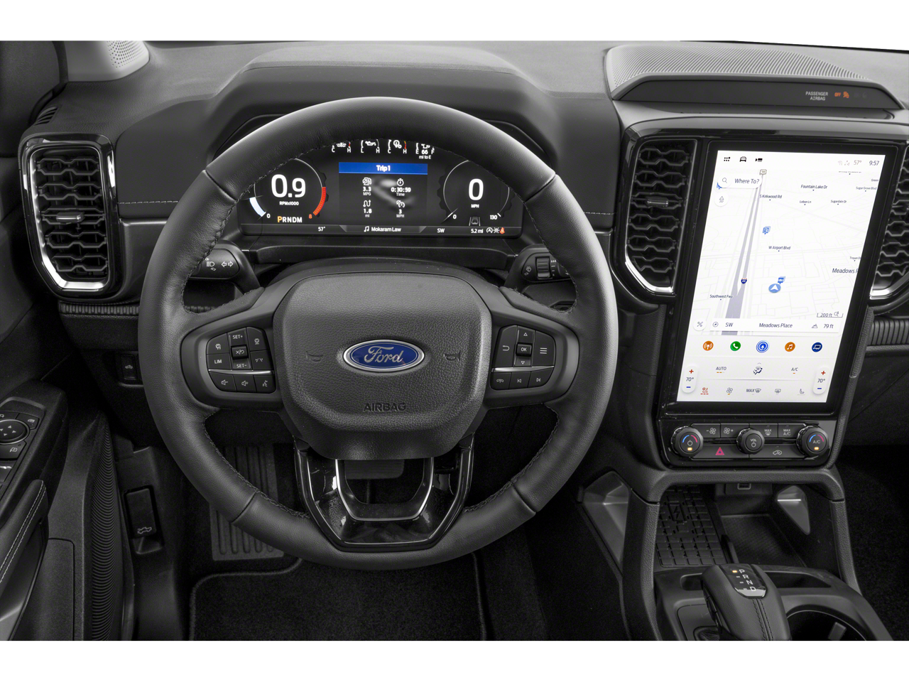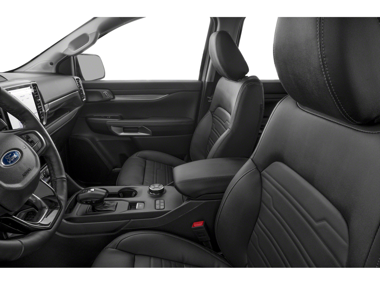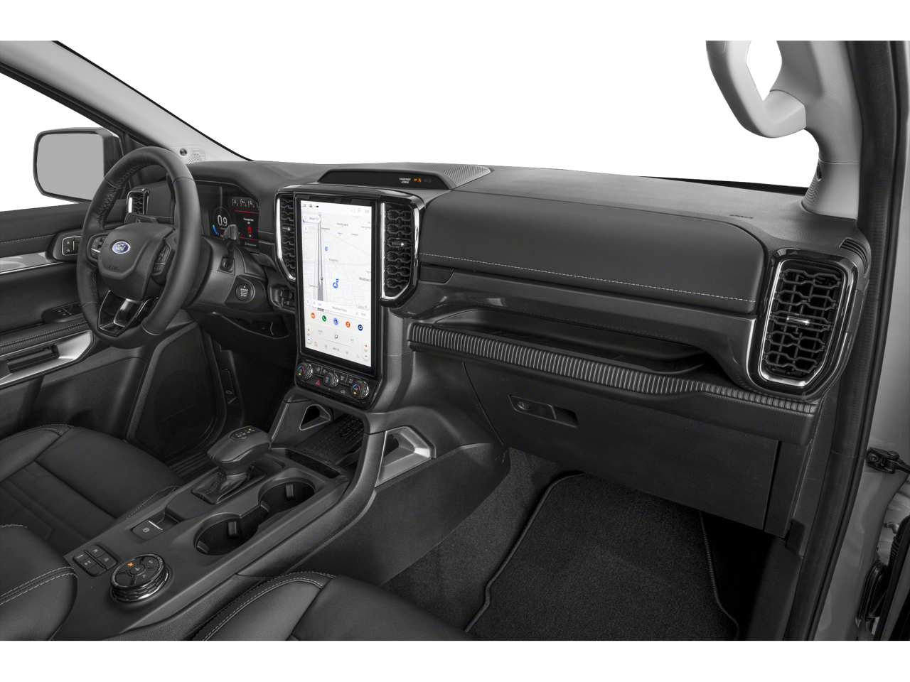 This 2024 Ford Ranger Lariat in Shadow Black comes with the following features: EcoBoost 2.3L I4 GTDi DOHC Turbocharged VCT 10-Speed Automatic 4WD Advanced Towing Package (Pro Trailer Backup Assist, Reverse Park Aid w/Trailer Guidance, and Trailer Brake Controller), Equipment Group 500A Standard, FX4 Off-Road Package (FX4 Off-Road Box Decal, FX4 Selectable Drive Modes, Off-Road Screen in Center Stack, and Off-Road Tuned Shocks), Sport Appearance Package (Gray Painted Center Bar & Grille Surround, Gray Painted Front Fascia & Rear Bumper, Gray Painted Wheel Lip Molding, and Sport Box Decal), Trailer Tow Package (Class IV Trailer Hitch Receiver), 4WD, 10 Speakers, 4-Wheel Disc Brakes, ABS brakes, Air Conditioning, Alloy wheels, AM/FM radio: SiriusXM, Auto High-beam Headlights, Auto-dimming Rear-View mirror, Automatic temperature control, Black Running Boards, Body-Color SecuriCode Keyless Entry Keypad, Brake assist, Compass, Delay-off headlights, Driver door bin, Driver vanity mirror, Dual front impact airbags, Dual front side impact airbags, Electronic Stability Control, Emergency communication system: SYNC 4 911 Assist, Exterior Parking Camera Rear, Front anti-roll bar, Front Bucket Seats, Front Center Armrest, Front dual zone A/C, Front fog lights, Front reading lights, Front wheel independent suspension, Fully automatic headlights, Garage door transmitter, Heated door mirrors, Heated front seats, Heated steering wheel, Illuminated entry, Leather Shift Knob, Leather steering wheel, Leather-Trimmed Front Heated Bucket Seats, Low tire pressure warning, Memory seat, Navigation system: Connected Navigation, Occupant sensing airbag, Outside temperature display, Overhead airbag, Overhead console, Panic alarm, Passenger door bin, Passenger vanity mirror, Power door mirrors, Power driver seat, Power passenger seat, Power steering, Power windows, Radio: B&O Sound System by Bang & Olufsen, Rain sensing wipers, Rear reading lights, Rear seat center armrest, Rear step bumper, Rear window defroster, Remote keyless entry, Security system, SiriusXM Satellite Radio, Speed control, Speed-sensing steering, Steering wheel mounted audio controls, SYNC 4A w/Connected Built-In Navigation, Telescoping steering wheel, Tilt steering wheel, Traction control, Trip computer, Turn signal indicator mirrors, Variably intermittent wipers, Voltmeter, and Wheels: 18 Machined Aluminum w/Dark Pockets.