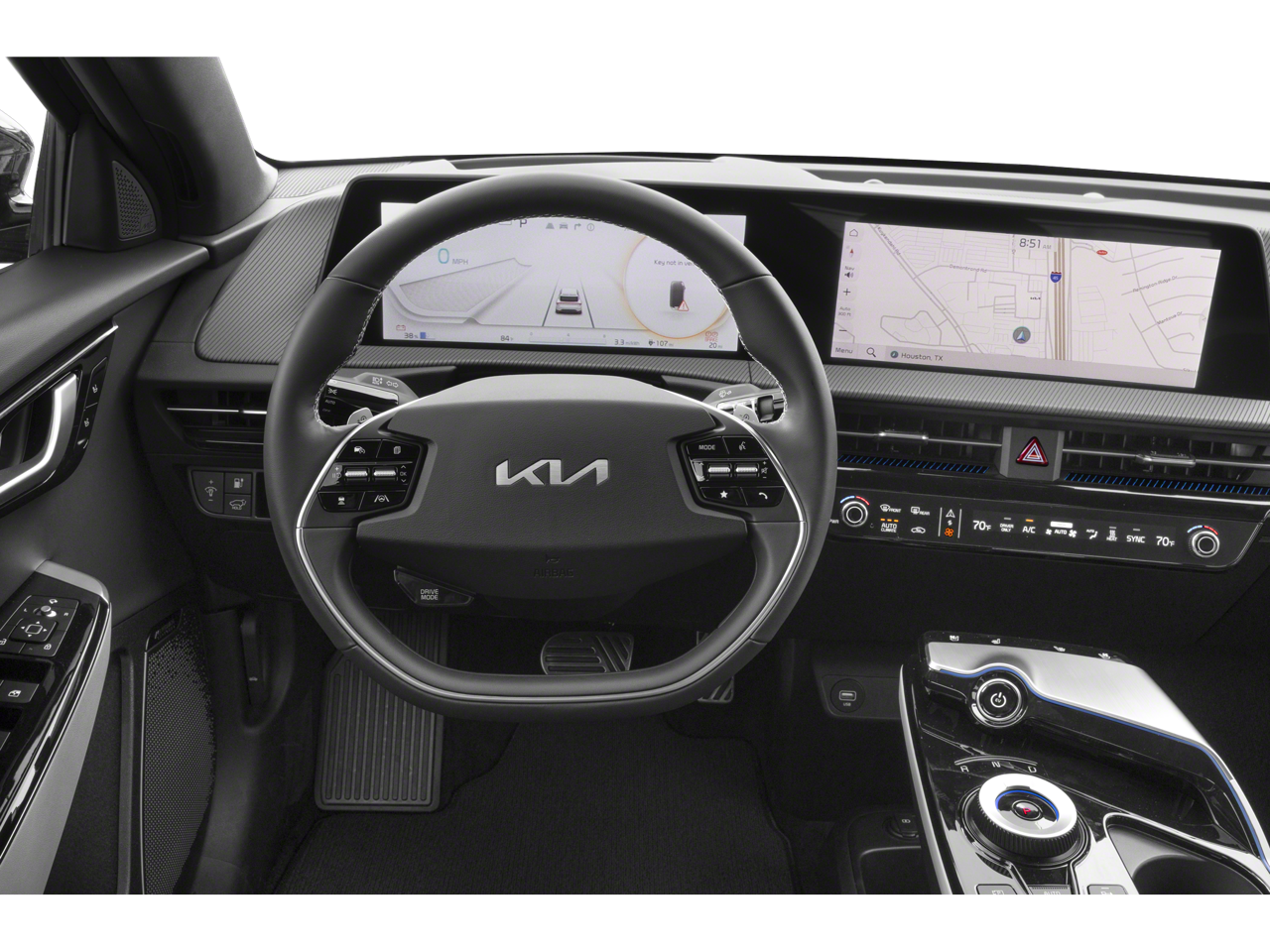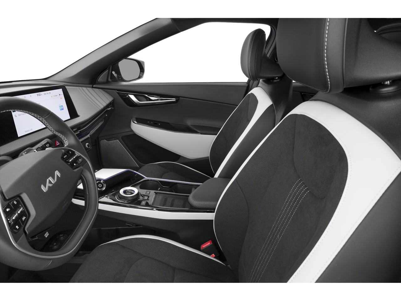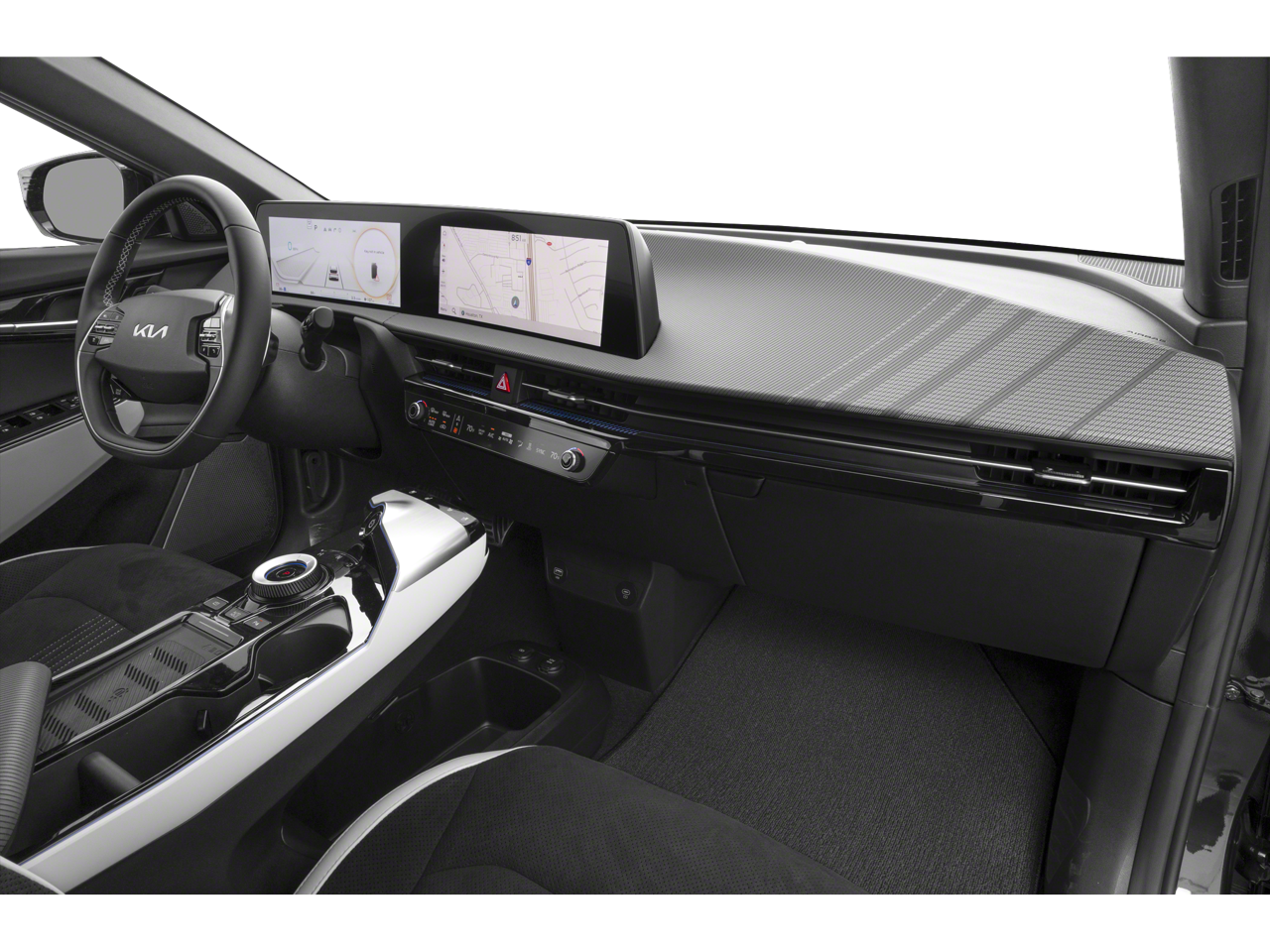 This 2024 Kia EV6 GT-Line comes nicely equipped with the following 14 Speakers, 4-Wheel Disc Brakes, ABS brakes, Air Conditioning, Alloy wheels, AM/FM radio: SiriusXM, Apple CarPlay & Android Auto, Auto High-beam Headlights, Auto-dimming Rear-View mirror, Automatic temperature control, Axle Ratio: 10.650, Brake assist, Bumpers: body-color, Cargo Cover, Cargo Mat w/Luggage Board, Carpet Floor Mats, Delay-off headlights, Driver door bin, Driver vanity mirror, Dual front impact airbags, Dual front side impact airbags, Electronic Stability Control, Emergency communication system, Four wheel independent suspension, Front anti-roll bar, Front Bucket Seats, Front Center Armrest, Front dual zone A/C, Front reading lights, Fully automatic headlights, Garage door transmitter: HomeLink, Heads-Up Display, Heated & Ventilated Front Seats (3-Stage), Heated door mirrors, Heated front seats, Heated rear seats, Heated steering wheel, Illuminated entry, Knee airbag, Low tire pressure warning, Memory seat, Navigation system: AVN 5.0 Navigation System, Occupant sensing airbag, Outside temperature display, Overhead airbag, Overhead console, Panic alarm, Passenger door bin, Passenger vanity mirror, Power door mirrors, Power driver seat, Power Liftgate, Power moonroof, Power passenger seat, Power steering, Power windows, Radio: Meridian Premium Audio System, Rain sensing wipers, Rear anti-roll bar, Rear seat center armrest, Rear window defroster, Remote keyless entry, Security system, Speed control, Speed-sensing steering, Split folding rear seat, Spoiler, Sport steering wheel, Steering wheel mounted audio controls, Telescoping steering wheel, Tilt steering wheel, Traction control, Trip computer, Turn signal indicator mirrors, Variably intermittent wipers, Vegan Leather Seat Trim, Ventilated front seats, and Wheels: 8.0J x 20 Black Painted Alloy. 106/86 City/Highway MPG